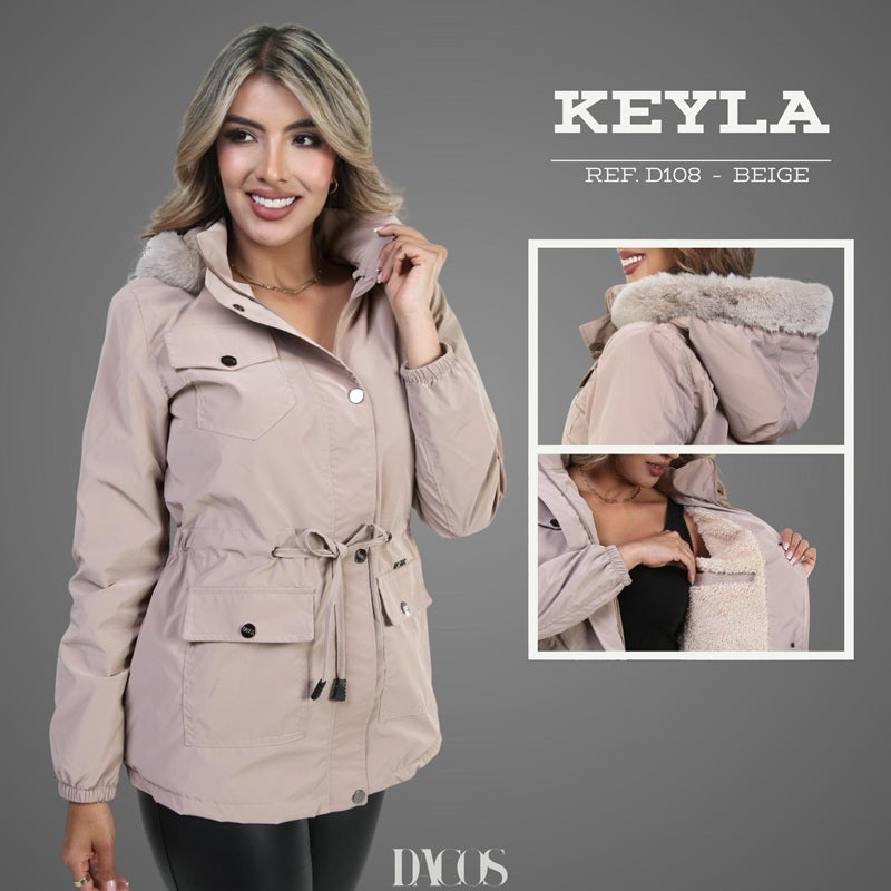 La chaqueta KEYLA combina elegancia y funcionalidad. Su diseño tipo parka con corte ajustable a la cintura resalta la silueta femenina, mientras que su interior en peluche tipo ovejero y capota con forro suave la hacen ideal para climas fríos. Perfecta para quienes buscan estilo y confort en un solo look.